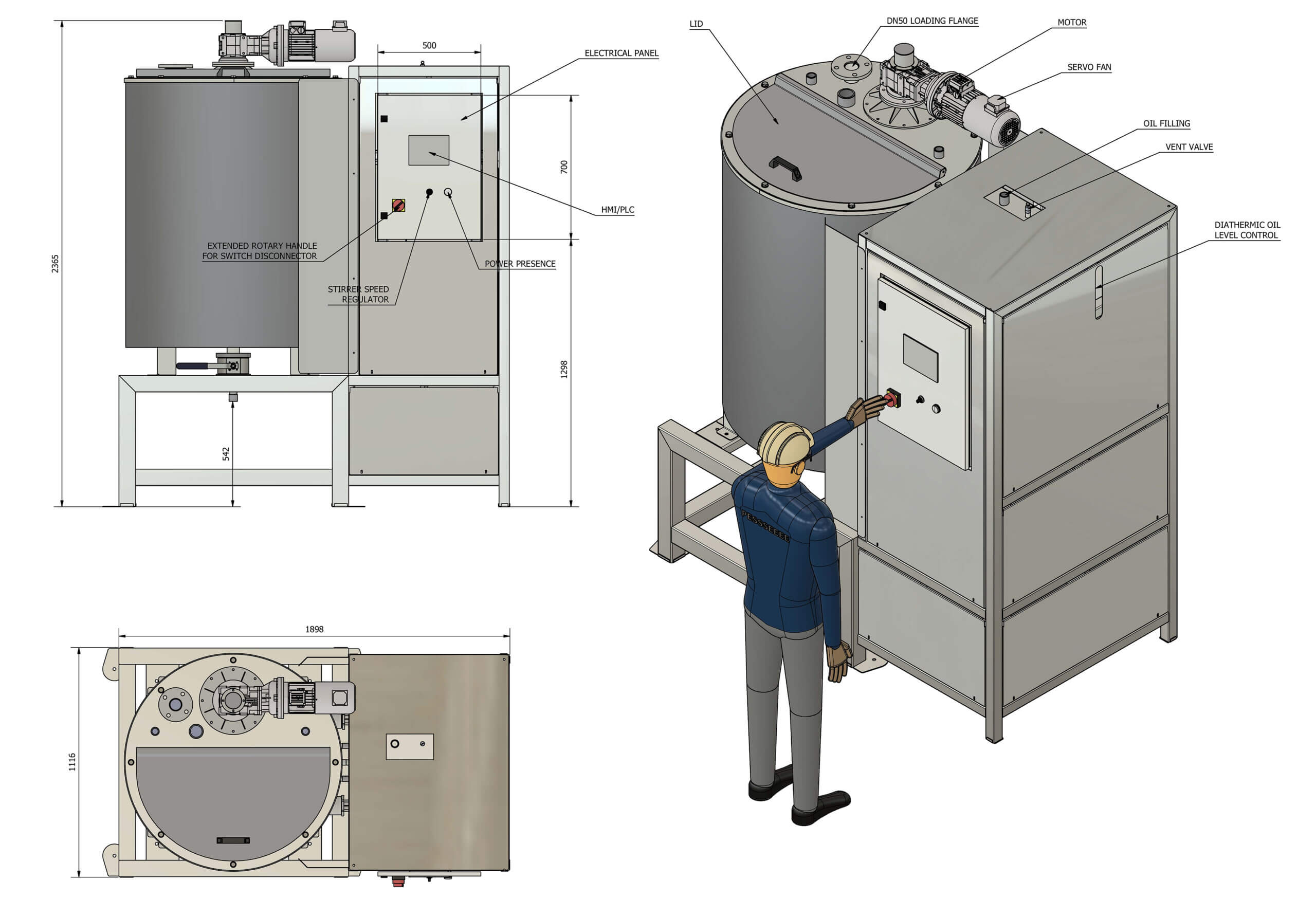 Heated tanks that rotate, ideal to unload thick viscous or dry products by tilting and pouring.  30, 60 and 120 litre capacities.